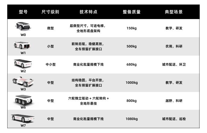 我们结合过往落地案例与行业趋势,将目前典型的中低速无人车应用需求划分为6 大类,并推荐了6 款智能线控底盘产品,覆盖从教学研发到复杂越野的多种任务需求: